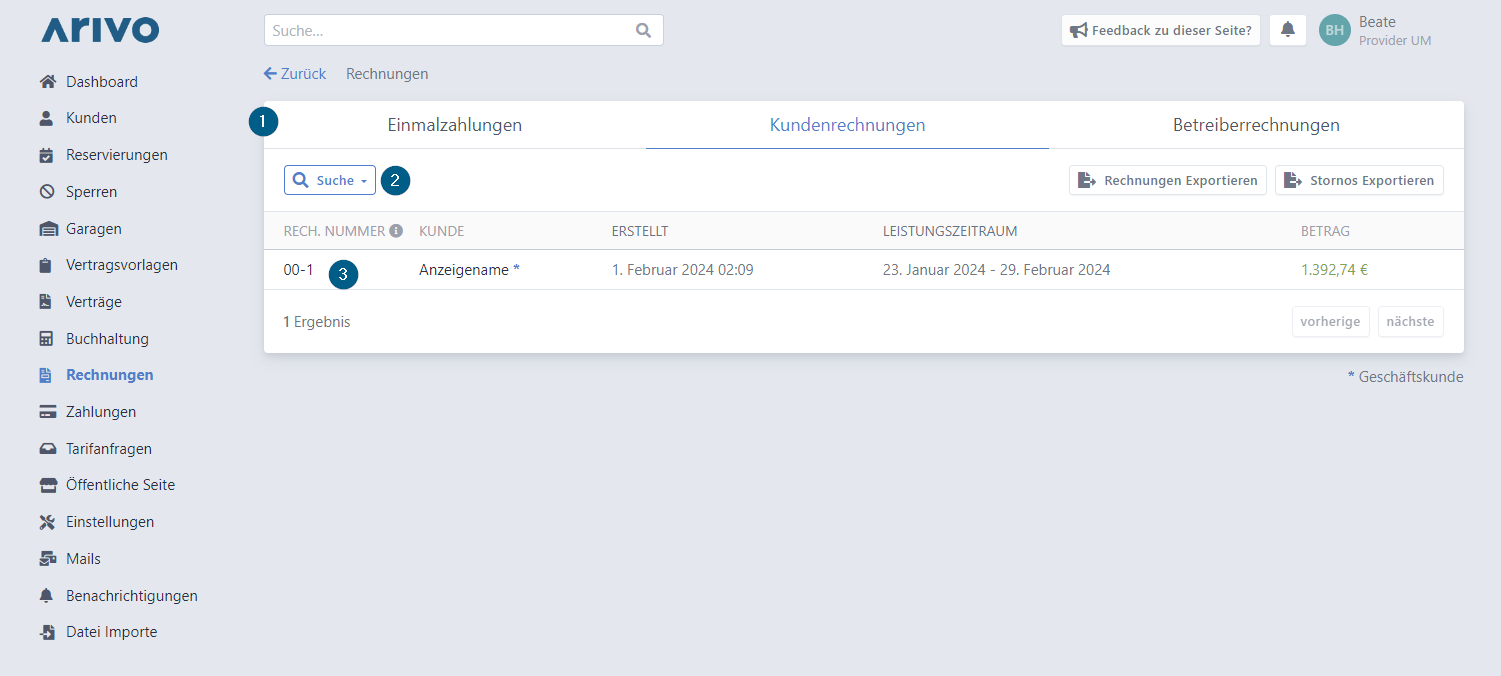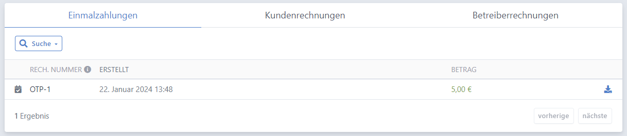 Die Rechnungsübersicht zeigt standardmäßig alle Kundenrechnungen, zusätzlich gibt es auch Einmalzahlungen und Betreiberrechnungen.