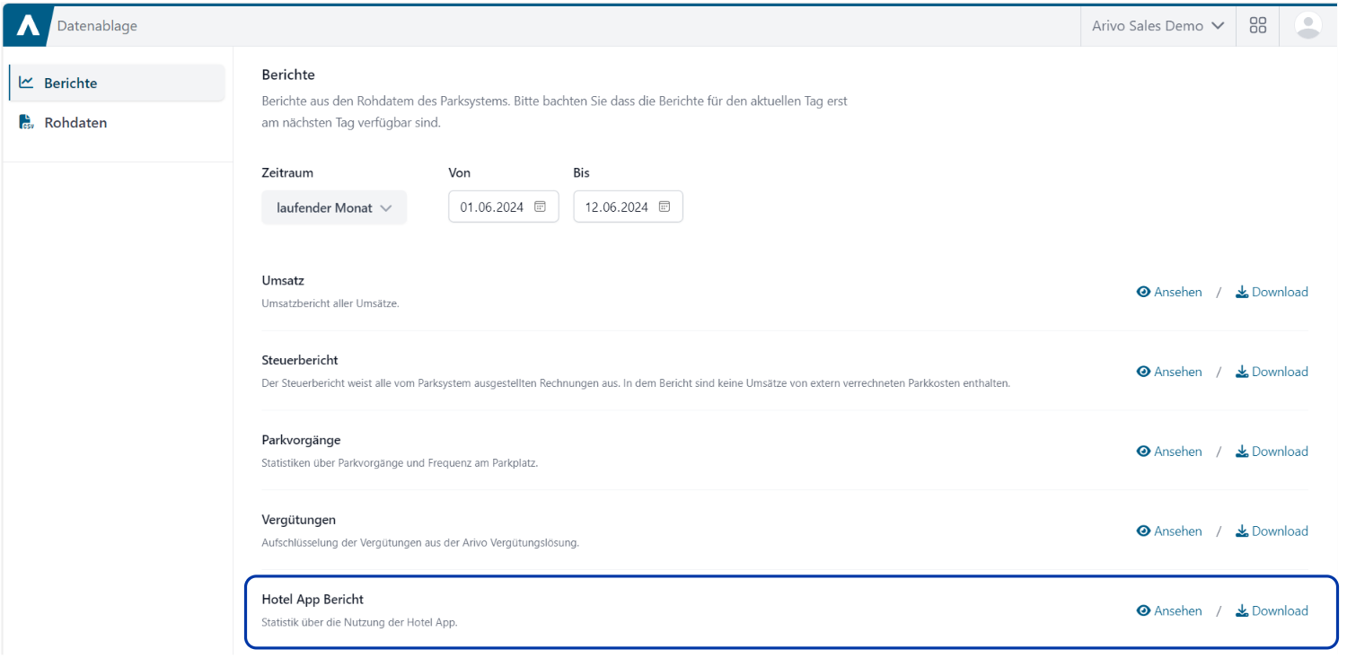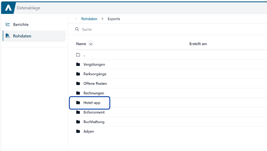 Sie finden in der Databox die Hotel App - Berichte filterbar nach Ihrem gewünschten Zeitraum und die zugehörigen Rohdaten im csv-Format. Eine Beschreibung des Exportes finden sie hier: Databox - Hotel App Bericht
